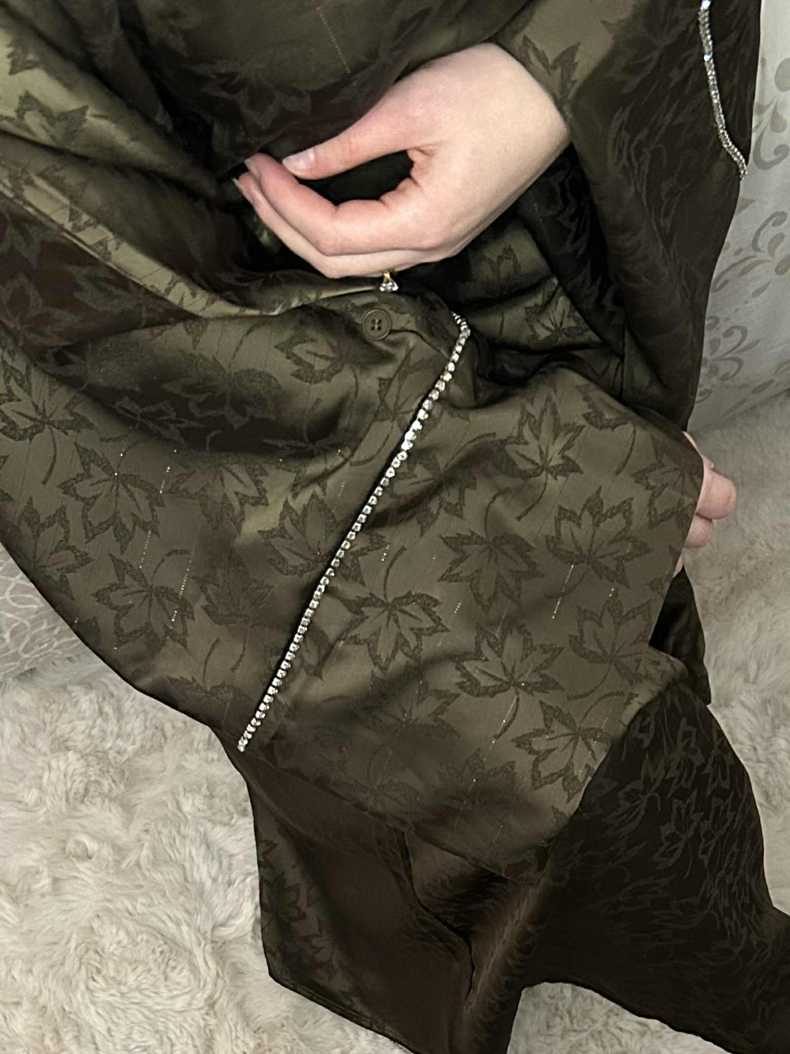 La coupe est ample, couvrante, pensée pour respecter pleinement la pudeur tout en offrant un tombé élégant. Les manches larges ajoutent du caractère, et le détail bijou au poignet vient relever l’ensemble avec finesse — juste ce qu’il faut pour se sentir soignée sans en faire trop.